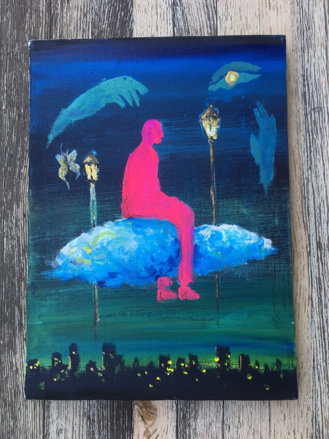 夜空に浮かぶひと粒の雲。その上に佇むシルエットは、都市のざわめきから離れ、ひそやかな夢想の世界へと誘います。ネオンピンクの人物像と淡いブルーの雲、街の灯りや街灯の光が織りなすコントラストが、現実と幻想の境界を曖昧にする一枚です。